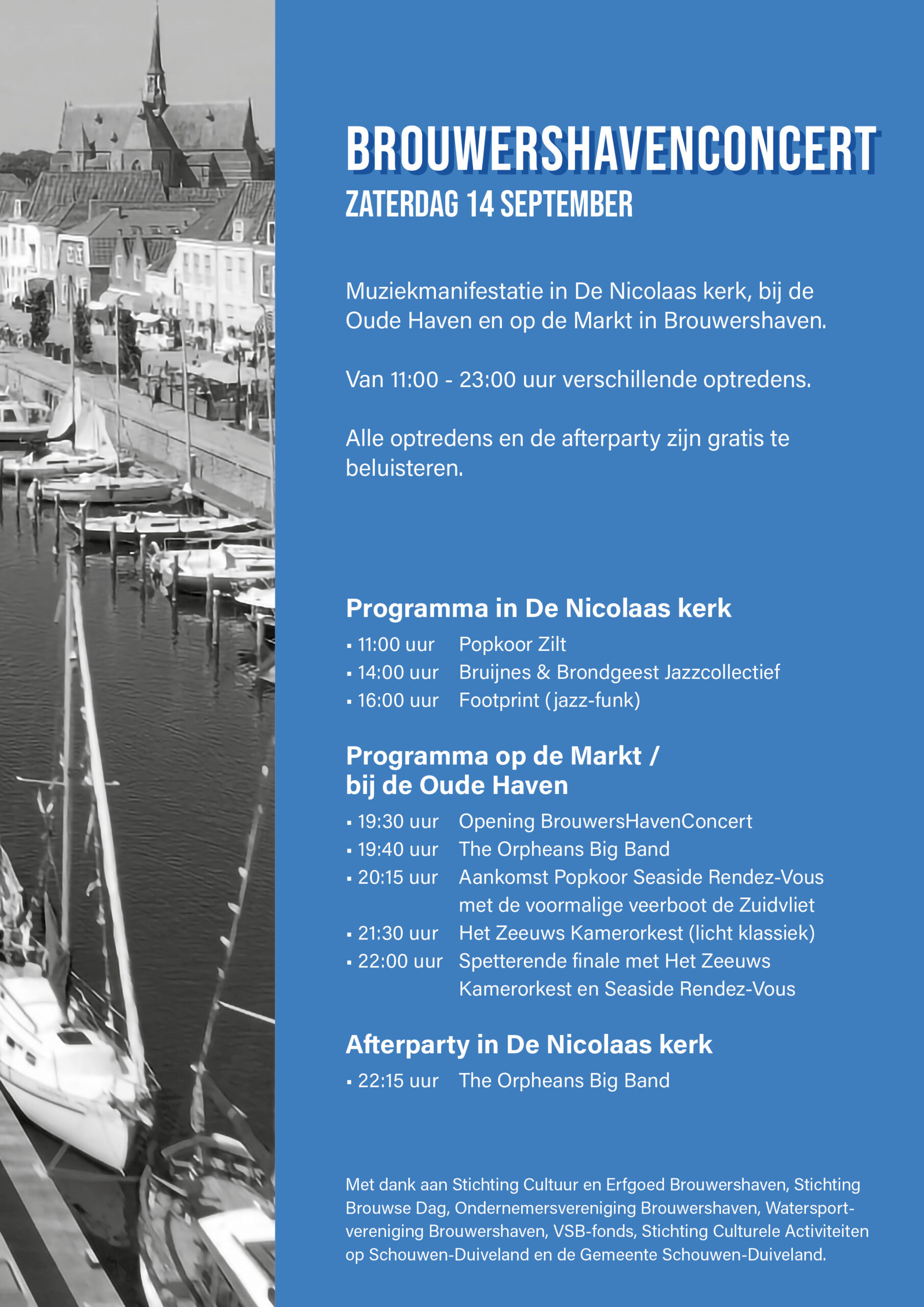 In de avond openluchtconcerten op de Markt en rond de Oude Haven in Brouwershaven.