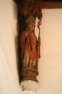 In het Koor, hoog tegen de kapconstructie vindt men nog steeds een tweetal schalkbeeldjes, van de heilige Nicolaas en van Jacobus de Meerdere.